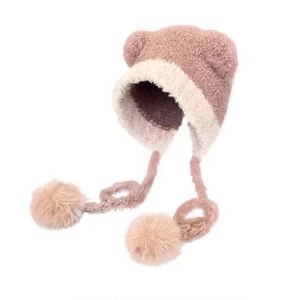 拼色帽子泰迪绒小熊耳朵绑带雷锋帽女韩国可爱冬天保暖护耳针织毛