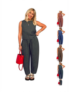 2025跨境欧美女装亚马逊TK新款纯色格子宽松休闲无袖背心长裤套装