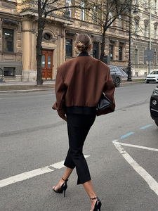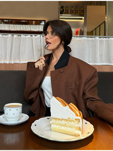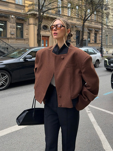 亚马逊跨境2025秋冬时尚新款复古棕色短款夹克外套毛呢百搭上衣女