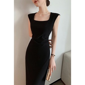 黑色赫本风方领无袖褶皱收腰连衣裙女2025夏季气质包臀长款