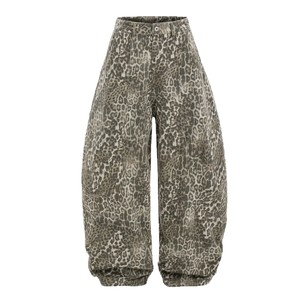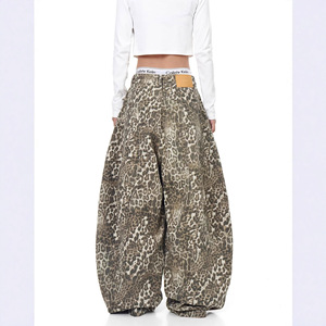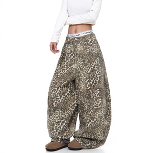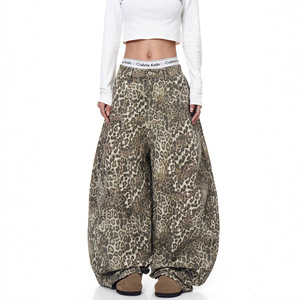 欧美复古宽松Y2K慵懒豹纹牛仔裤女辣妹设计感时髦拖地做旧弯刀裤