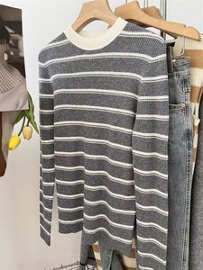 复古条纹圆领长袖秋季新款简约百搭女上衣针织衫