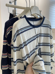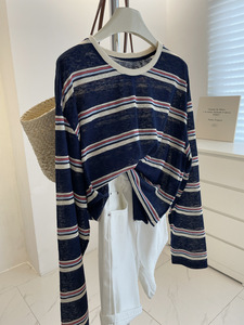 复古显白撞色领条纹防晒衫女垂感2025新款宽松显瘦休闲长袖t恤