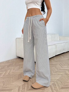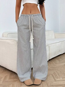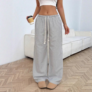 欧美跨境2025新款条纹直筒长裤休闲百搭系带时尚宽松阔腿女
