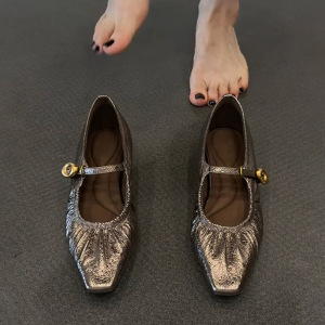 羊皮版~真皮复古平底褶皱内增高玛丽珍鞋女2025新款一字扣带单鞋