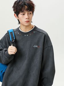 立体分割结构质感仿麂皮绒圆领卫衣男秋款潮牌彩色刺绣套头衫外套