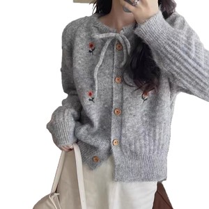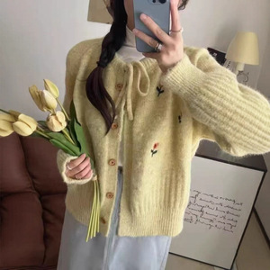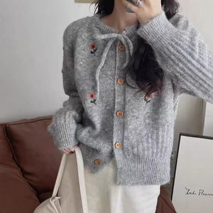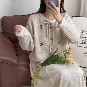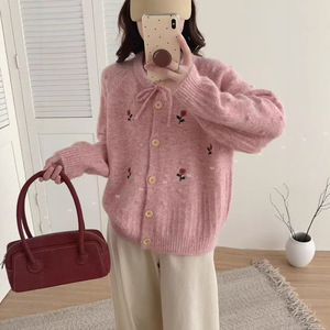 韩系秋冬新款花朵刺绣针织开衫温柔风重工优雅甜美清新毛衣外套女