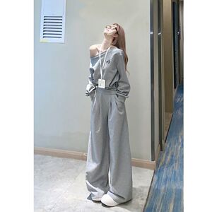 2025春夏休闲韩系慵懒风短款收腰显瘦斜肩上衣高腰阔腿长裤两件套