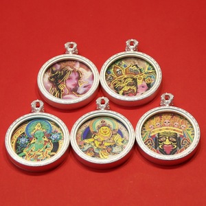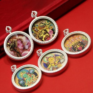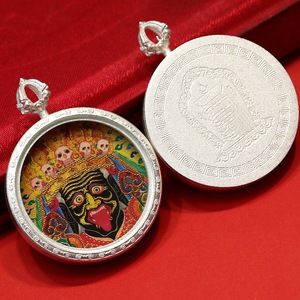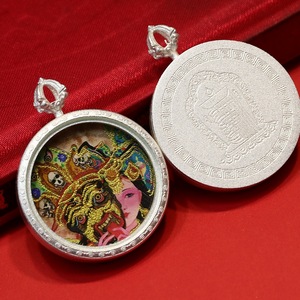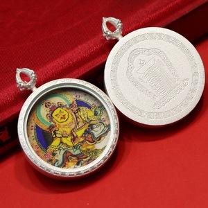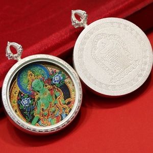 爆款手绘描金唐卡3厘米圆形吊坠银色扎基拉姆狐仙绿度母画芯批