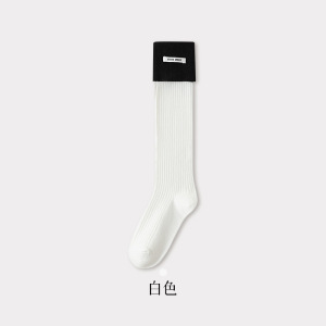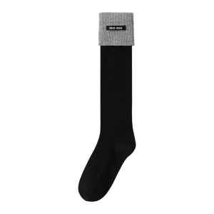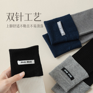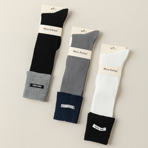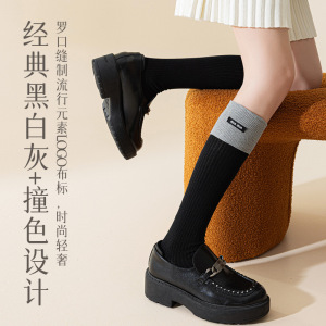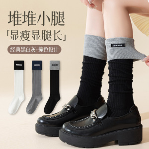 miu系字母布标小腿袜子女双针秋季新款翻边拼色堆堆袜女长筒袜子