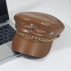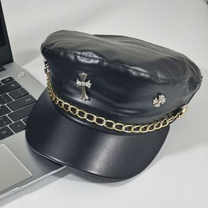 朋克风帽子女秋冬复古PU皮质海军帽个性链条报童帽时尚克罗平顶帽