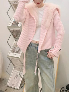 重工设计感穿绳飘带拼接毛领针织开衫女2025秋冬新款气质毛衣外套