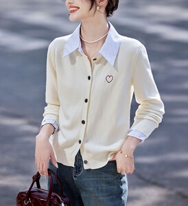 2025春秋新款韩系减龄爱心开衫法式衬衣领气质叠穿假两件针织衫潮