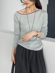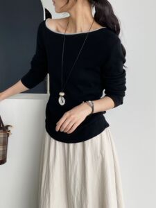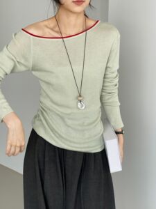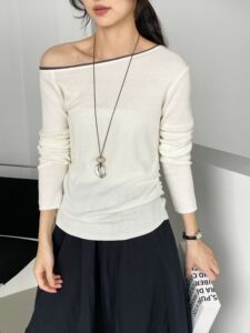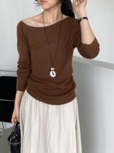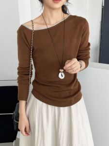 那末早秋6羊毛斜肩撞色针织衫女慵懒风温柔修身百搭套头上衣Y1219