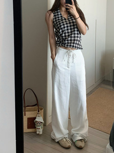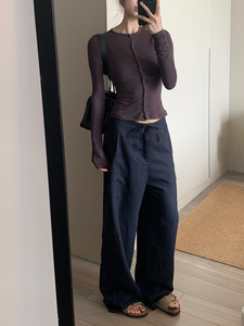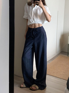 chao级推荐!夏季薄款藏青色亚麻宽松直筒裤女百搭显瘦窄版阔腿裤