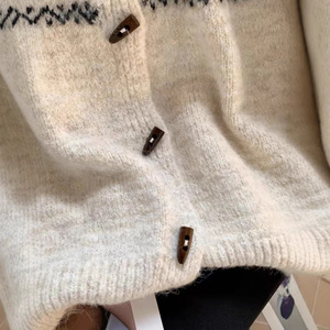 2025春秋新款牛角扣宽松针织开衫百搭减龄提花刺绣复古毛衣外套女
