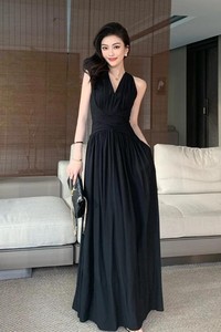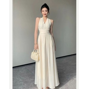 法式白色无袖挂脖v领连衣裙女2025夏季新款绝美收腰显瘦大摆长裙