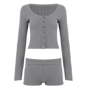 韩系气质休闲风麻花料V领修身开衫短裤套装女外贸新款纯色两件套