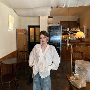 法式气质v领褶皱白色衬衫女装2025秋季新款宽松显瘦小众别致上衣
