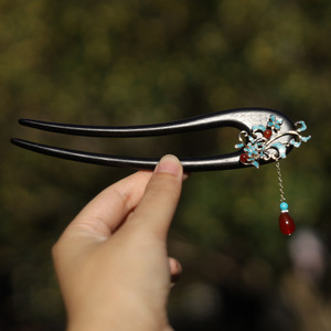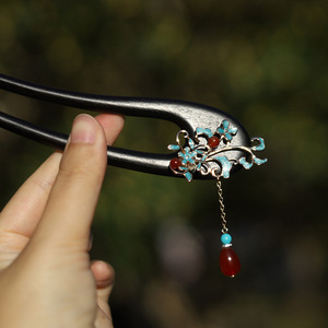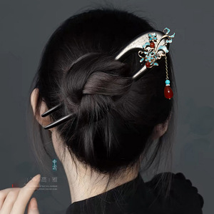 古典烧蓝u型黑檀木蝴蝶双面中式仿点翠高级感国风发簪女旗袍配饰