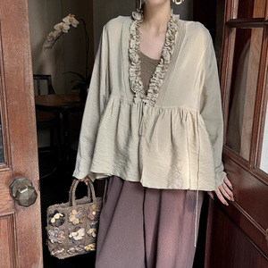 Owis匠心的浪漫全手工花朵立体门襟双层下摆系带娃娃衫上衣开衫