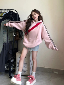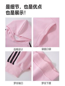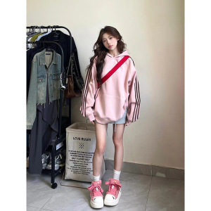 热卖爆款粉色三条杠连帽卫衣女初秋款2025新款穿搭美式款通勤风