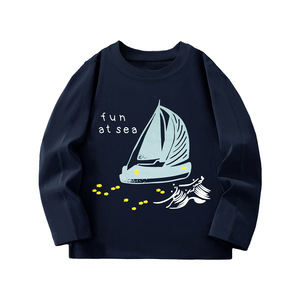 欧美新款2025年秋冬儿童长袖T恤男童装卡通帆船印花图圆领针织衫