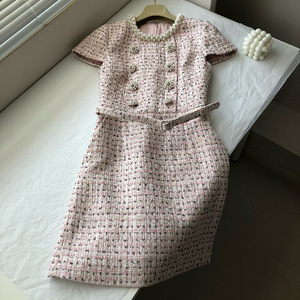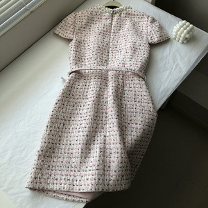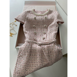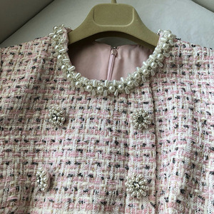 纯原 SP2025秋冬新款粉色小香短袖珍珠镶钻连衣裙
