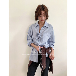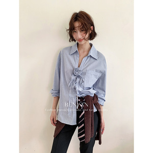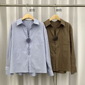 本言 秋法式花朵装饰系带落肩慵懒风衬衫女时尚百搭格子上衣82226