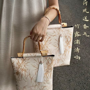 竹节手提米色竹叶空包+白祥云盖帽流苏 约长21*宽7.5*高27cm