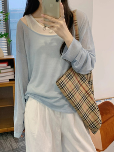 蓝色两件套冰丝针织衫防晒罩衫女夏季薄款外搭长袖t恤多巴胺上衣
