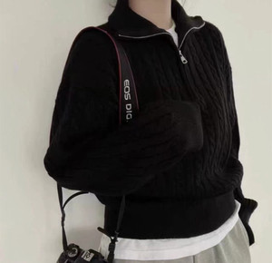 翻领设计感麻花拉链针织衫秋冬女装长袖纯色气质宽松上衣女套头