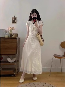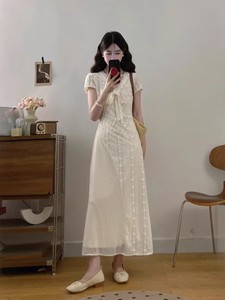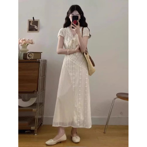 法式温柔风蕾丝拼接短袖连衣裙女夏季新款小众气质收腰显瘦短裙潮