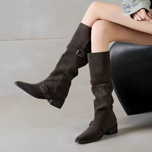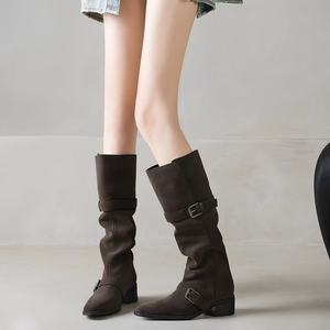 2025年秋冬季新款时尚百搭粗跟复古长筒靴女皮带扣褶皱堆堆靴高筒