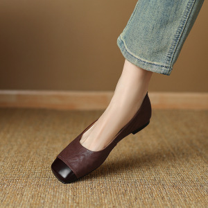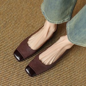 法式方头真皮单鞋女通勤百搭小香风软底奶奶鞋简约平底浅口小皮鞋