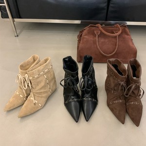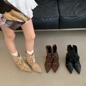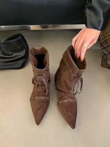 内增高绒面尖头短靴女鞋2025新款春秋单靴系带配裙子西部牛仔靴子
