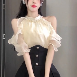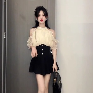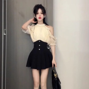 新品亚马逊欧美夏季新款珍珠挂脖露肩气质亮丝雪纺衫短裙感两件套