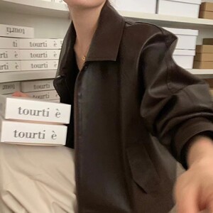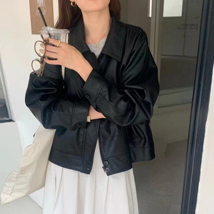 2025秋冬新款复古翻领拉链口袋宽松百搭BF风机车服皮衣外套上衣女