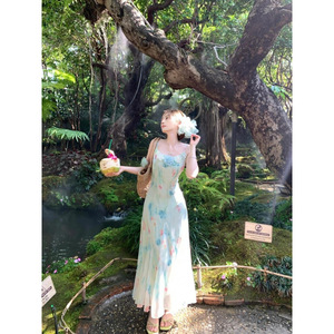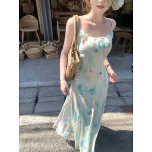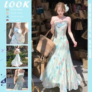 法式绝美海边度假穿搭油画风甜美碎花裙子立体花朵收腰鱼尾连衣裙