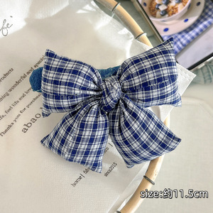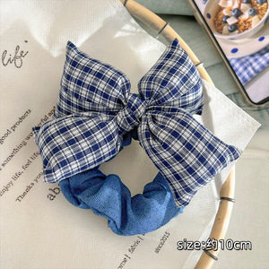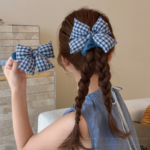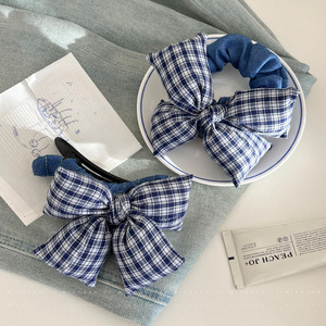 韩系蓝色格子蝴蝶结鸭嘴夹女高弹力大肠发圈耐用发绳发夹气质头饰