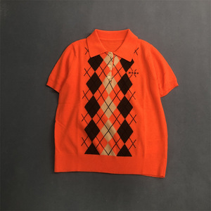糕货mm撞色菱格纯羊毛衫polo领针织衫上衣女休闲半袖套头毛衣秋冬