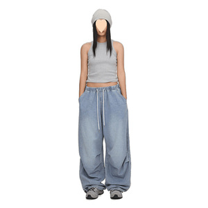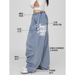 现货 街舞潮牌蓝色嘻哈复古牛仔裤女百搭美式跳舞裤子爵士休闲裤
