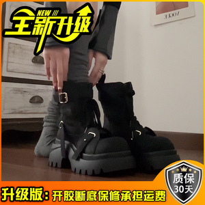 时尚百搭皮靴系带厚底马丁靴女秋冬季英伦风搭扣系带机车靴单靴潮