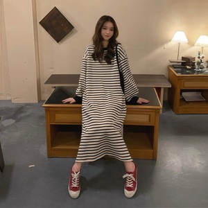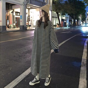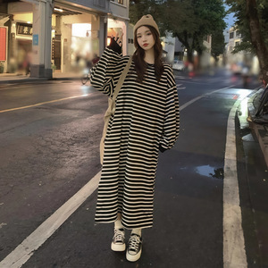 复古条纹卫衣连衣裙女秋季长款过膝遮肉显瘦休闲宽松学院风t恤裙