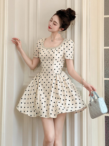 2025夏季新款女装法式复古钉珠方领收腰波点短袖蓬蓬连衣裙21768