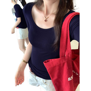热销莱赛尔天丝修身U领中袖羊毛T恤女2025夏薄款轻奢高级感上衣