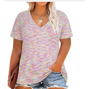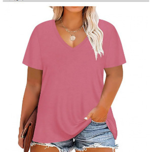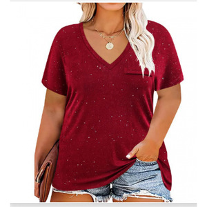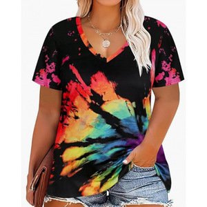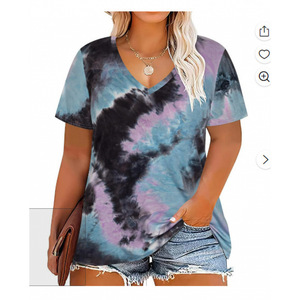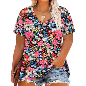 跨境欧美女装2024亚马逊外贸印花短袖侧面抽褶V领短袖女T恤