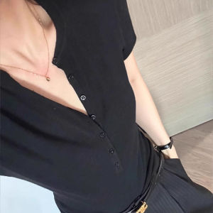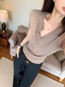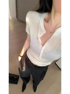 2025夏季新款美式纽扣半开领短袖T恤女上衣修身褶皱遮肉打底衫潮