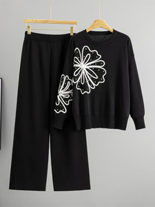 跨境秋冬欧美针织女装时尚套装女秋长袖烫钻花朵毛衣阔腿裤两件套
