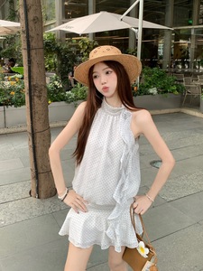 韩式纯欲波点挂脖飘带无袖背心连衣裙女夏季时尚气质休闲显瘦短裙